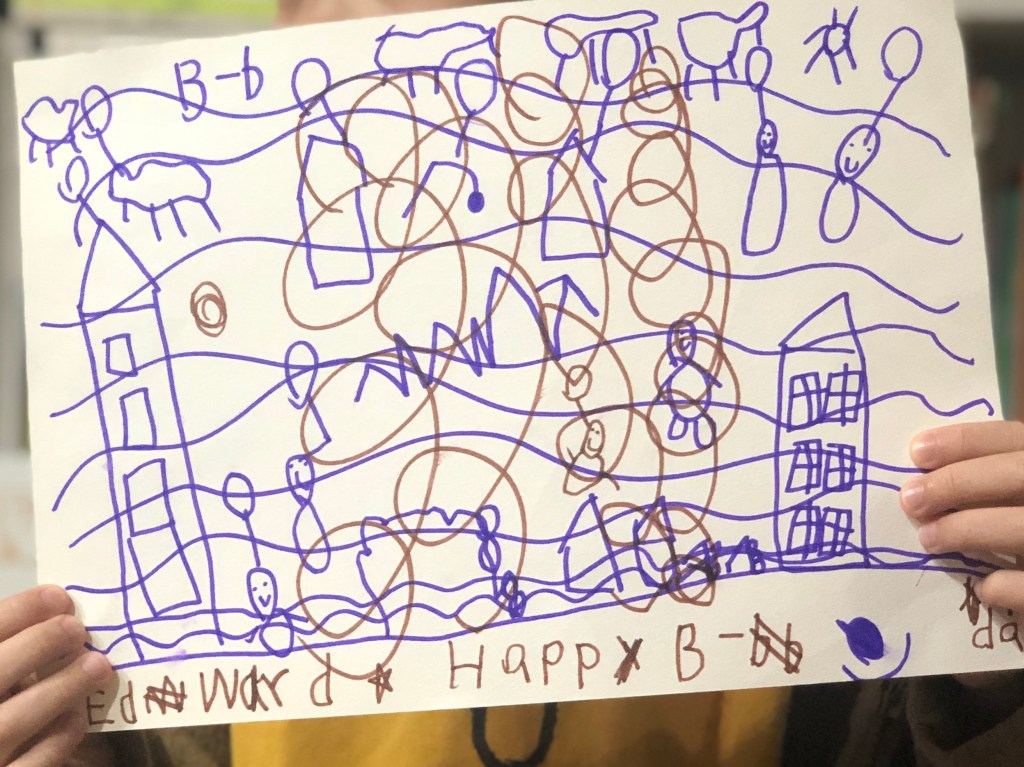 在晚餐后,他还兴致大发地加工了生日画,非要加入龙卷风,连带把代表爸爸的拿着气球漂浮在空中的棕色小人也席卷了。真是让人哭笑不得:)