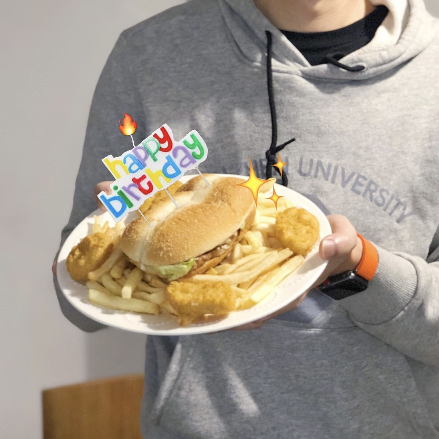 梁先生每年的生日都比较特殊,大多都是在回老家过年的奔波的路上。而今年的生日就更特殊了,保险起见,我们不仅没有出去吃大餐,可惜地也没买到小蛋糕。最“奢侈”的庆祝方式莫过于梁先生在外出采购时,顺便给自己的生日准备了大餐——麦当劳!