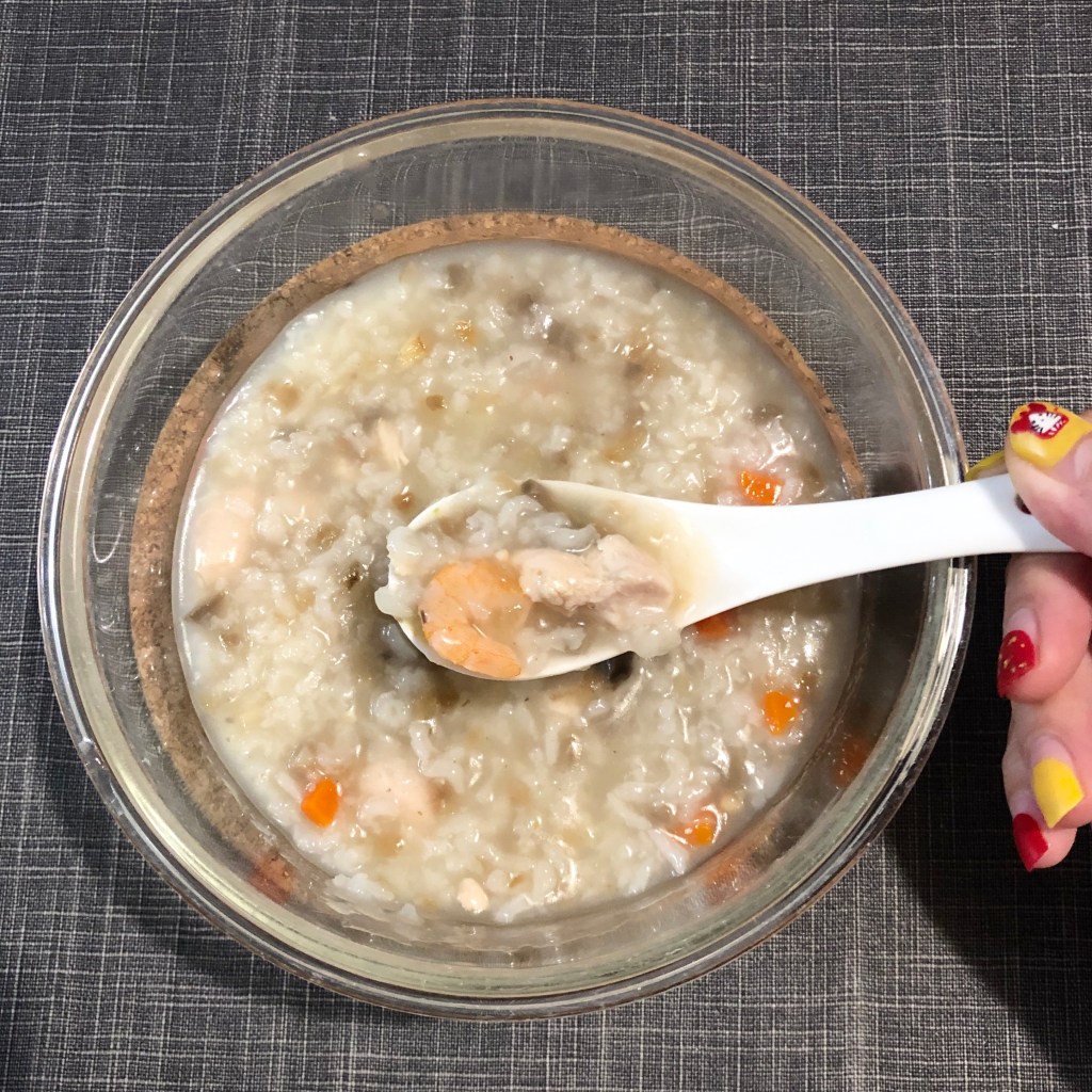 打开冰箱,拿出昨天中午梁先生做白酱意面剩余的蘑菇、昨晚晚餐做寿司的胡萝卜切一小段,冷冻柜里的冰鲜的南美虾仁,熬成一锅粥,最后拌入被闲置来了很久的“炒萝卜干”,瞬间让这锅粥拥有了一个潮汕的灵魂!